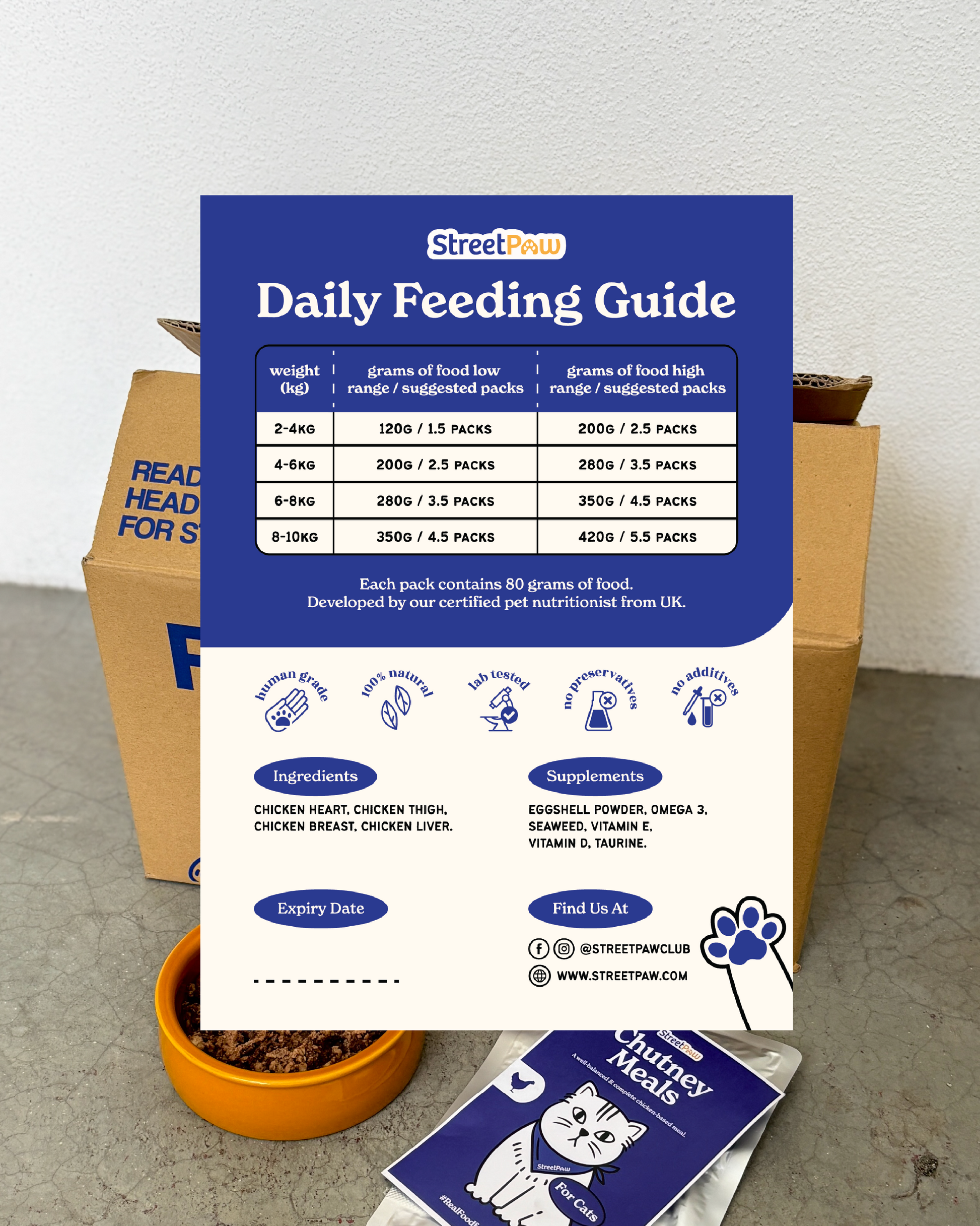 The Chutney Project for Cats by StreetPaw is a well balanced and complete meal formulated by a fully certified pet nutritionist from England. Each pouch contains 80g of meals, and each box contains 50 pouches.